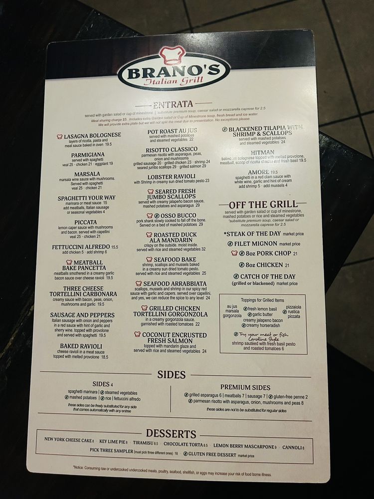 Brano's Italian Grill in Cocoa Beach, FL offers a wide range of Italian, pizza, and seafood dishes. With a casual atmosphere and outdoor seating, it's a great spot for groups, families, and date nights. The menu features specialties like gluten-free pizza, Amore Spaghetti with red clam sauce, and Antipasto with various protein add-ons. Their promotions like Kids Eat Free on Tuesdays and Wine Wednesday specials add value to the dining experience. Customers rave about the delicious food, excellent service, and authentic Italian vibe. From meatball samplers to Lobster Ravioli, the dishes are cooked to perfection and served with care. Whether it's a romantic dinner or a family outing, Brano's Italian Grill offers a memorable dining experience that keeps customers coming back for more.